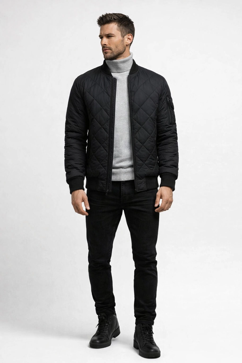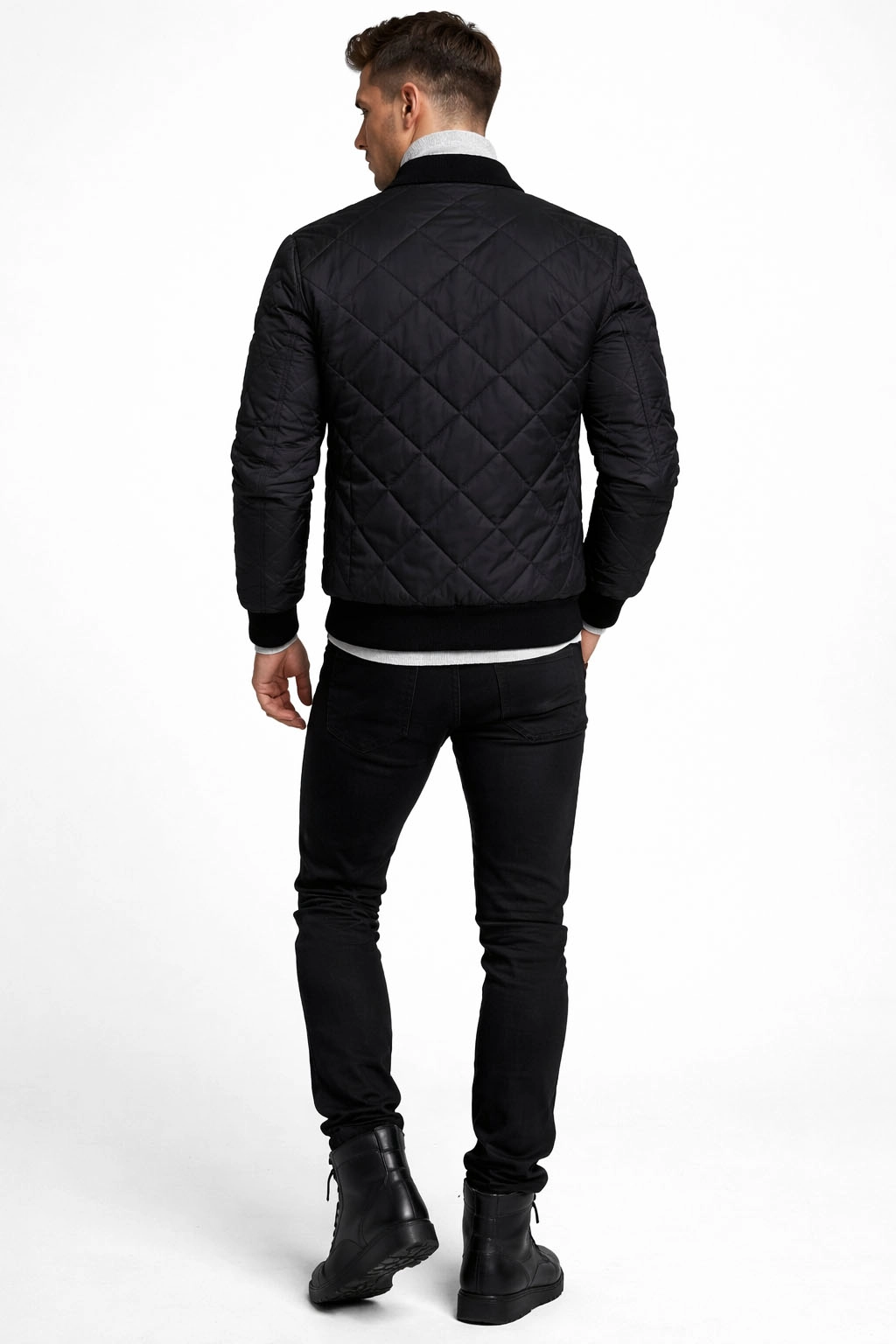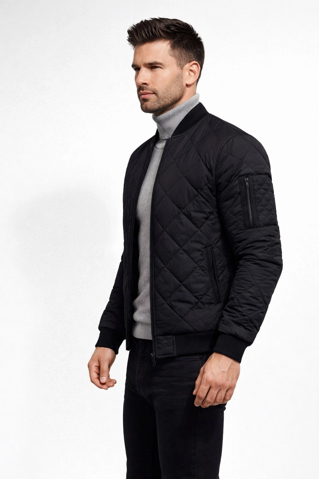Kurtka męska typu bomber to idealne rozwiązanie na przejściową pogodę - kurtka w kolorze, który zawsze jest na czasie. Bomberka ta posiada dużo praktycznych udogodnień np. zasuwane na suwak kieszenie boczne oraz jedna na ramieniu, rękawy na ściągaczach. Materiał wierzchni posiada pikowania w karo. Od wewnątrz podszewka. Kurtka zapinana na zamek błyskawiczny. Materiał z jakiego jest wykonana ta czarna kurtka to 100% poliester.